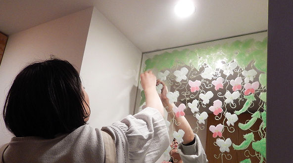 スギヤマカナヨさんの日本理化学工業(株)川崎工場ウインドーギャラリー第18弾「キットパスの大きな木 キットパスの花々」(2018年12月1日)